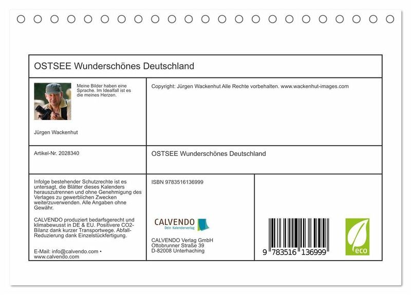 In stiller, fast meditativer Haltung zeigt uns der Fotograf Jürgen Wackenhut die Ostsee einmal von einer ganz anderen Seite. Dabei ist es die Ruhe und die ausgleichende Gestaltung seiner Bilder, die dem Betrachter diesen wunderschönen Landstrich Monat für Monat näher bringt.