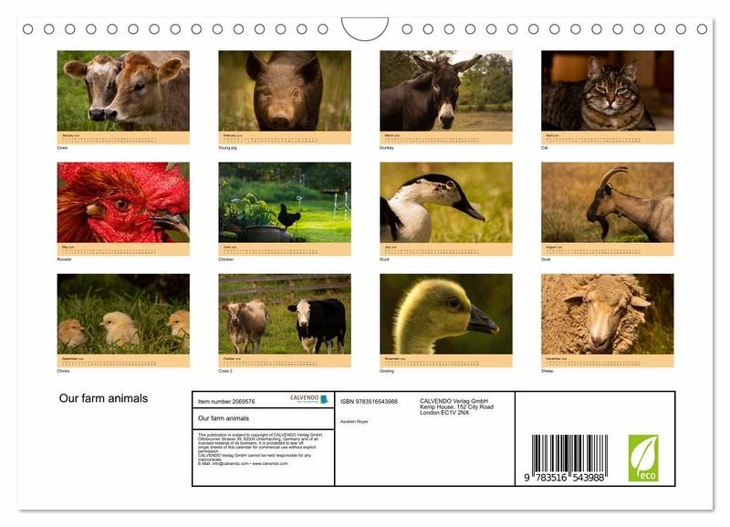 QUALITY - High-quality photo calendar with 12 beautiful images on light-resistant paper, robust spiral binding with hanger.SUSTAINABLE - Significant waste reduction due to print-on-demand production, environmentally friendly FSC-certified paper, produced in the UK, climate-conscious logistical processes.PERFECT GIFT - calendars for friends and family, for children, all ages and all occasions, from Christmas to birthdays and everything in between.LOTS OF CHOICE - Wall calendars in different sizes (DIN A4 and DIN A3), for any topic and personal taste, featuring photography, painting and illustrations.Farm animals photography, author: Aurélien Royer
