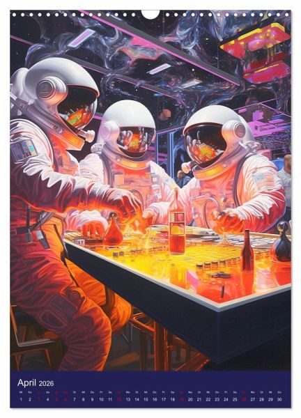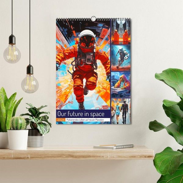 Unsere mögliche Zukunft! Dieser Kalender zeigt coole Vision des Lebens auf einem neuen Planeten. Dargestellt in einer Serie von modernen Illustrationen, die mit KI generiert wurden und Space-Restaurant, Shopping Mall, Himmelbar, galaktisches Event und weitere Szenen aus dem Weltall-Leben zeigen. Jeder Monat enthüllt ein faszinierendes Bild, das die pulsierende Atmosphäre und die künstlerische Pracht einer Welt jenseits unserer Vorstellungskraft einfängt. Dieser Kalender ist perfekt für Science-Fiction-Liebhaber.