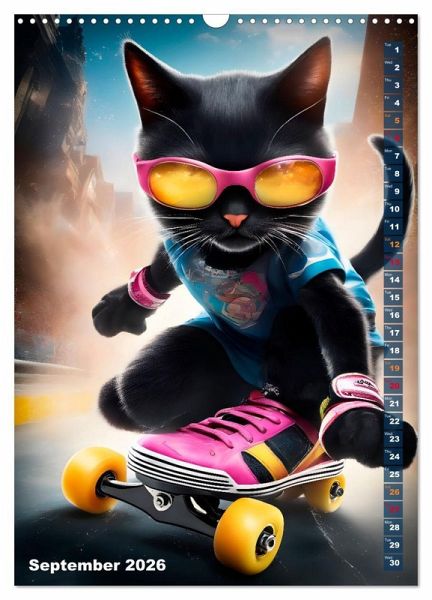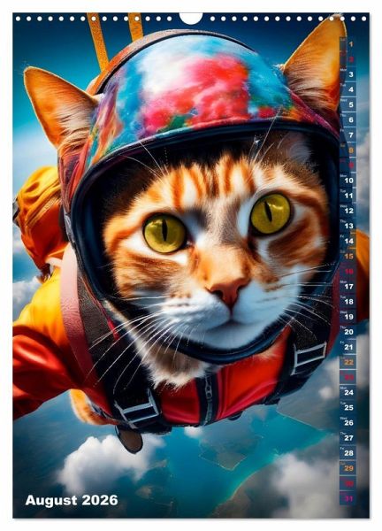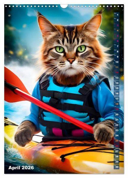 Adventurous cats demonstrate in this charming calendar, what they do on their daily forays. Discover next to skating, surfing, diving or snowboarding other activities of our four-legged friends. The images were created in collaboration with artificial intelligence as well as no animal suffering and were fine-tuned to their final appearance by the calendar author herself.