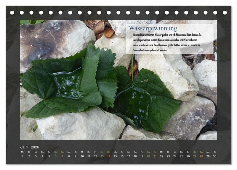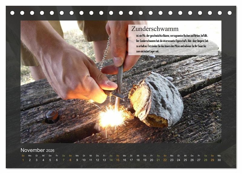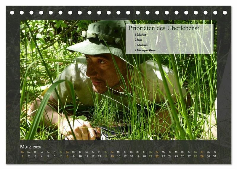 Der Kalender vereint aussagekräftige Bilder und wichtige Informationen. Monat für Monat wird Wissen vermittelt, das Sicherheit für Survival-Situationen schenkt.
