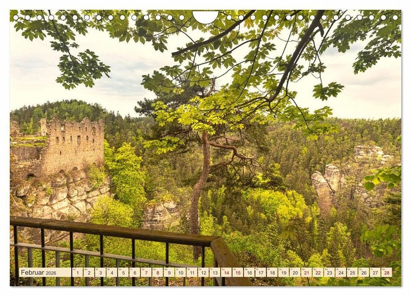 Februar: Burg und Kloster Oybin auf dem 514 m hohen Sandsteinmassiv in einem von Vulkanen umschlossenen Talkessel.