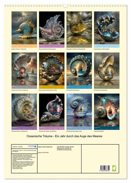 QUALITÄT - Hochwertiger Fotokalender mit 12 wunderschönen Motiven auf lichtbeständigem Bilderdruckpapier, robuste Spiralbindung mit Aufhängebügel.NACHHALTIG - deutliche Abfallreduzierung durch bedarfsgerechte Einzelstückfertigung, umweltfreundliches FSC-zertifiziertes Papier, Produktion in Deutschland, klimabewusste Logistik.PERFEKTES GESCHENK - Kalender für Freunde und Familie, für Kinder und Erwachsene, jung und alt, zu Weihnachten, Geburtstag oder zwischendurch.VIELFALT - Bildkalender in verschiedenen Formaten, z.B. DIN A5, DIN A4, DIN A3 sowie DIN A2. Ob Naturmotiv, Gemälde oder Fotos, ideal für ein persönliches Wohlfühlambiente.Entdecke die Magie des Meeres - jeden Monat neu. "Ozeanische Träume" zeigt fantastische Welten in kunstvollen Muscheln: geheimnisvoll, träumerisch, einzigartig. Ein Kalender für alle, die Schönheit und Fantasie lieben. von Autor(in): Dagmar Schmeißer