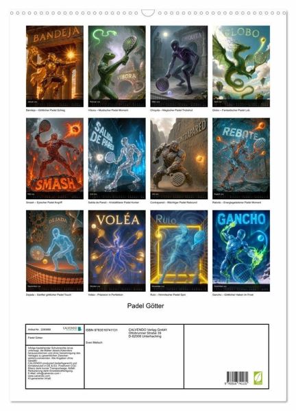 Erlebe Padel auf eine völlig neue Art! Die Götter des Padel verbindet die Faszination dieses dynamischen Sports mit epischer Fantasy-Kunst. Jeder Monat zeigt einen ikonischen Schlag - von der präzisen Bandeja über den kraftvollen Smash bis zum eleganten Globo. Mächtige Fantasiewesen, göttliche Energie und spektakuläre Farben symbolisieren Technik, Geschwindigkeit und Emotion. Ein außergewöhnlicher Wandkalender für Padelspieler, Fans und Kunstliebhaber - ideal als Geschenk oder Inspiration für das nächste Match. 12 detailreiche Motive voller Bewegung und Leidenschaft - eine Hommage an den wohl kreativsten Rückschlagsport der Welt. Alle Bilder wurden mit Unterstützung von KI-Technologie gestaltet.