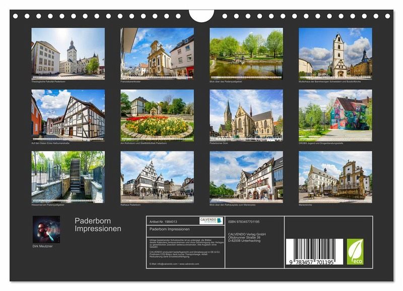 Der Fotograf Dirk Meutzner hat mit seinem Fotoapparat die Stadt Paderborn erkundet und herausgekommen ist dieser farbenprächtige Kalender. Er wird Sie Monat für Monat begleiten und Sie werden begeistert sein. Die Stadt Paderborn ist mit über 150.000 Einwohnern eine Großstadt im östlichen Teil des Landes Nordrhein-Westfalen. Sie liegt im gleichnamigen Kreis Paderborn und hat die Funktion der Kreisstadt, ist Universitätsstadt, Oberzentrum und Mittelpunkt der Region Hochstift Paderborn.