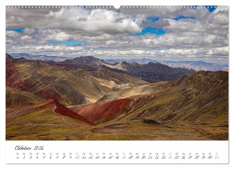 Von den schillernden Rottönen über die leuchtenden Gelb- und Grüntöne bis hin zu den sanften Blautönen - dieser Kalender entführt dich auf eine visuelle Reise durch die atemberaubende Farbenpracht des Rainbow Mountain Palccoyo. Die lebendigen Bilder werden dich mit ihrer Detailgenauigkeit und ihrer fesselnden Schönheit begeistern und dir einen Einblick in dieses bemerkenswerte Naturwunder geben.