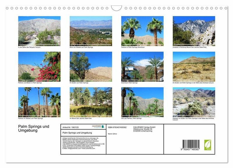 QUALITÄT - Hochwertiger Fotokalender mit 12 wunderschönen Motiven auf lichtbeständigem Bilderdruckpapier, robuste Spiralbindung mit Aufhängebügel.NACHHALTIG - deutliche Abfallreduzierung durch bedarfsgerechte Einzelstückfertigung, umweltfreundliches FSC-zertifiziertes Papier, Produktion in Deutschland, klimabewusste Logistik.PERFEKTES GESCHENK - Kalender für Freunde und Familie, für Kinder und Erwachsene, jung und alt, zu Weihnachten, Geburtstag oder zwischendurch.VIELFALT - Bildkalender in verschiedenen Formaten, z.B. DIN A5, DIN A4, DIN A3 sowie DIN A2. Ob Naturmotiv, Gemälde oder Fotos, ideal für ein persönliches Wohlfühlambiente.Die im sonnenverwöhnten südlichen Kalifornien im Coachella Valley liegende Stadt wird von Bergketten, atemberaubenden Tälern und Nationalparks umgeben. von Autor(in): Martin Gillner