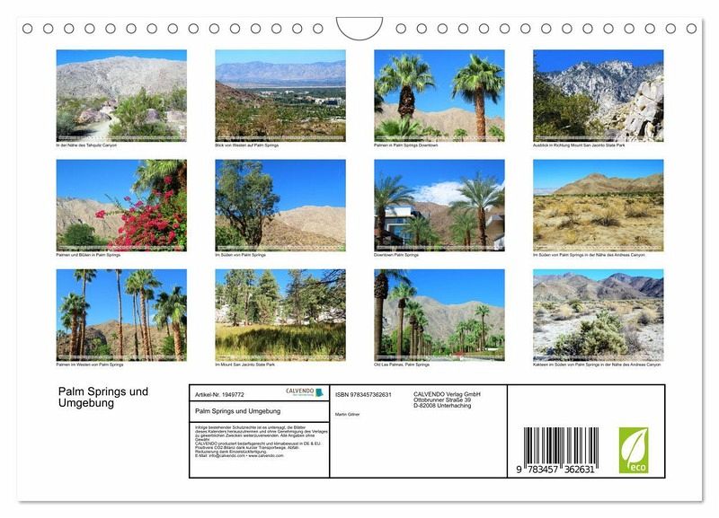 QUALITÄT - Hochwertiger Fotokalender mit 12 wunderschönen Motiven auf lichtbeständigem Bilderdruckpapier, robuste Spiralbindung mit Aufhängebügel.NACHHALTIG - deutliche Abfallreduzierung durch bedarfsgerechte Einzelstückfertigung, umweltfreundliches FSC-zertifiziertes Papier, Produktion in Deutschland, klimabewusste Logistik.PERFEKTES GESCHENK - Kalender für Freunde und Familie, für Kinder und Erwachsene, jung und alt, zu Weihnachten, Geburtstag oder zwischendurch.VIELFALT - Bildkalender in verschiedenen Formaten, z.B. DIN A5, DIN A4, DIN A3 sowie DIN A2. Ob Naturmotiv, Gemälde oder Fotos, ideal für ein persönliches Wohlfühlambiente.Die im sonnenverwöhnten südlichen Kalifornien im Coachella Valley liegende Stadt wird von Bergketten, atemberaubenden Tälern und Nationalparks umgeben. von Autor(in): Martin Gillner