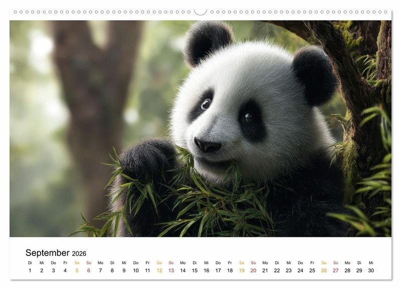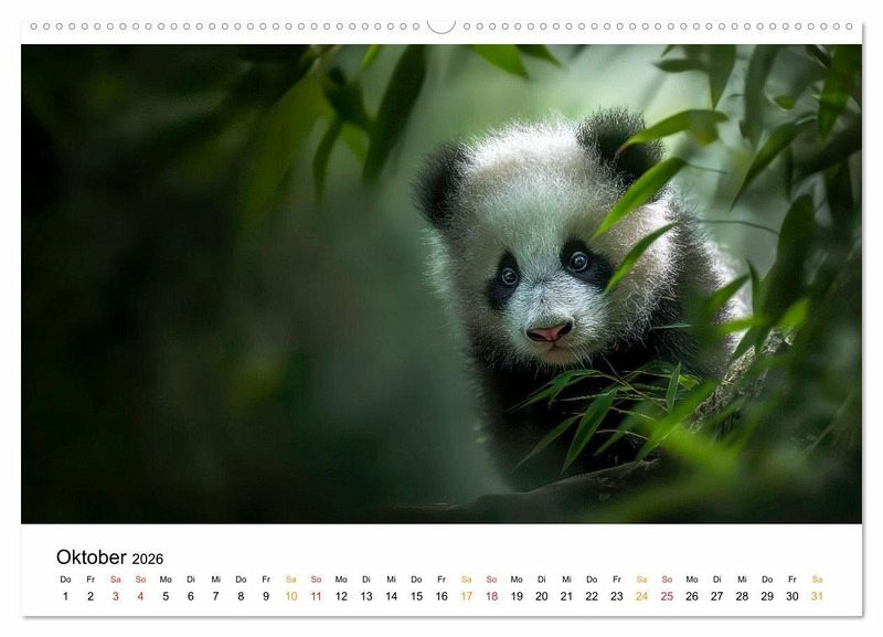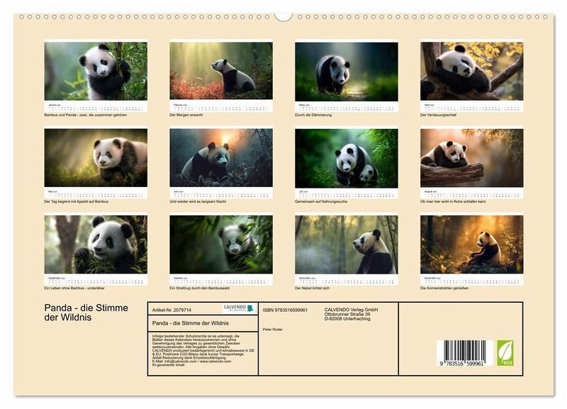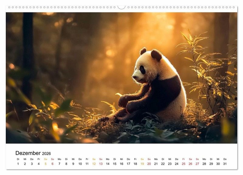 Tauchen Sie ein in die stille Magie der Wildnis und erleben Sie die Welt des Pandas - mal im goldenen Licht der Morgendämmerung, mal im sanften Schein der untergehenden Sonne. Bewundern Sie diese bezaubernden Geschöpfe mit ihren dunklen Kulleraugen, weißen Ohren und dem flauschigen Fell - einfach knuffig. Jedes dieser wunderbarer KI-Bilder erzählt eine leise Geschichte von Freiheit, Ursprünglichkeit und dem Zauber unberührter Natur der Pandas. Ein Kalender für Naturliebhaber, Tierfreunde und alle, die sich nach einem Stück Wildnis im Alltag sehnen.