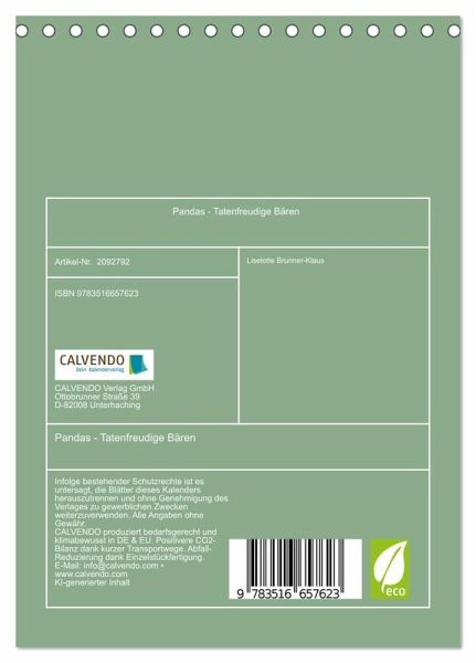 QUALITÄT - Hochwertiger Fotokalender mit 12 wunderschönen Motiven auf lichtbeständigem Bilderdruckpapier, robuste Spiralbindung.NACHHALTIG - deutliche Abfallreduzierung durch bedarfsgerechte Einzelstückfertigung, umweltfreundliches FSC-zertifiziertes Papier, Produktion in Deutschland, klimabewusste Logistik.PERFEKTES GESCHENK - Kalender für Freunde und Familie, für Kinder und Erwachsene, jung und alt, zu Weihnachten, Geburtstag oder zwischendurch.VIELFALT - Bildkalender in verschiedenen Formaten, z.B. DIN A5, DIN A4, DIN A3 sowie DIN A2. Ob Naturmotiv, Gemälde oder Fotos, ideal für ein persönliches Wohlfühlambiente.Anthropomorphe niedliche Pandas von Autor(in): Liselotte Brunner-Klaus