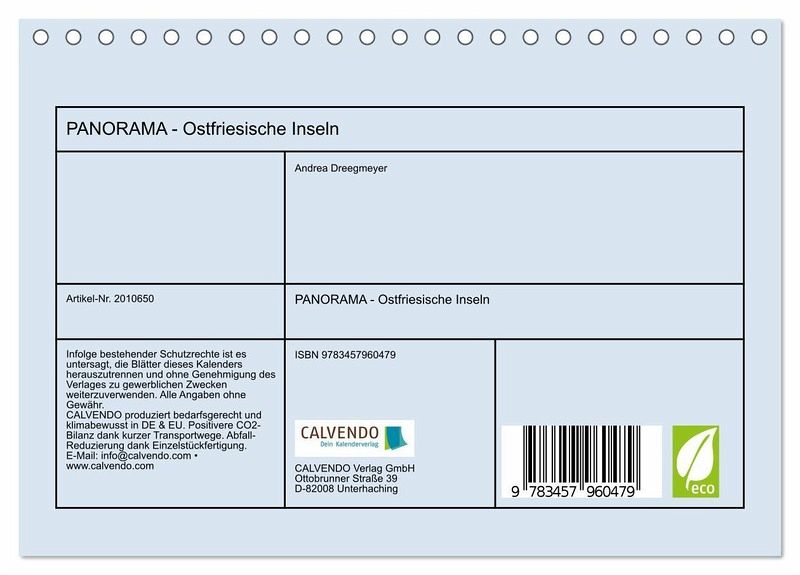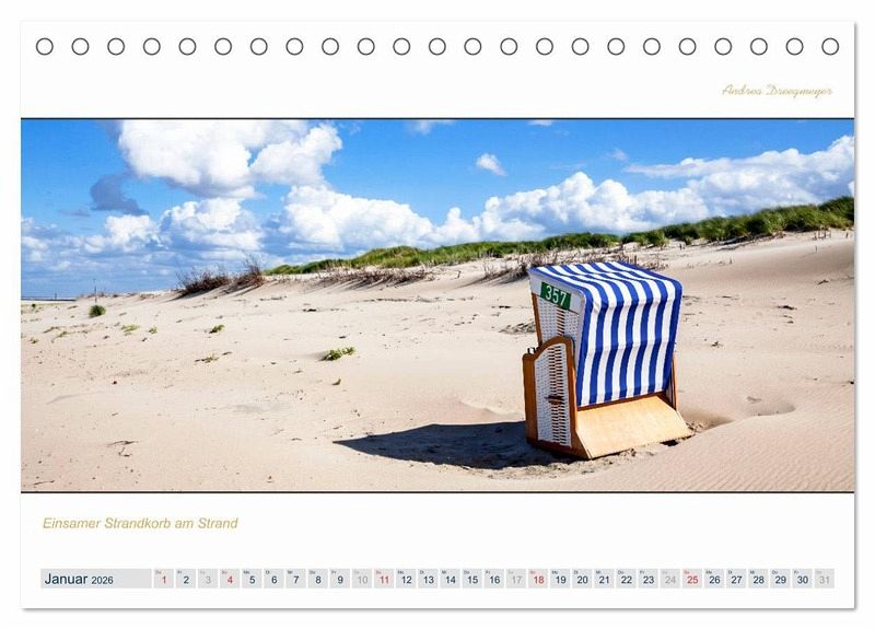 Dieser Kalender mit den atemberaubenden Fotos von Andrea Dreegmeyer wurde im Panoramaformat erstellt, so dass die Weite der Ostfriesischen Inseln für den Betrachter noch besser zur Geltung kommt. Die Fotos sind Aufnahmen von den Inseln Borkum,Langeoog und Norderney.
