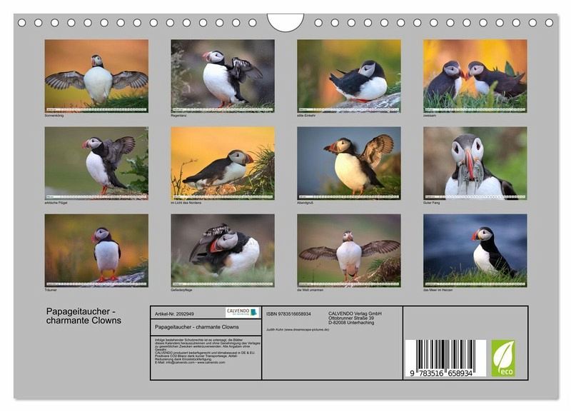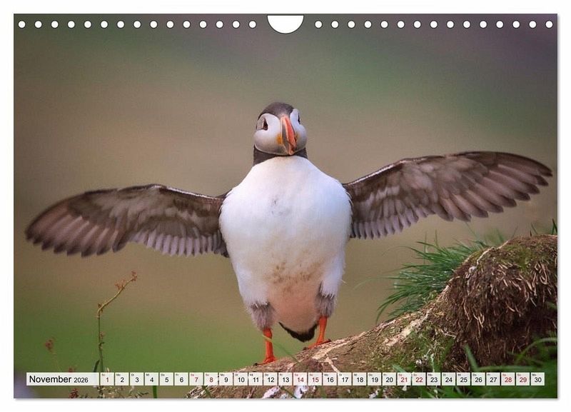Mit ihren bunten Schnäbeln, neugierigen Blicken und watschelnden Bewegungen gehören Papageitaucher zu den liebenswertesten Bewohnern der nordischen Küsten. Dieser Kalender zeigt eindrucksvolle Momente aus ihrem Leben in Island - vom erfolgreichen Fischfang über ausgiebige Gefiederpflege bis hin zu ruhigen Szenen im Licht der Mitternachtssonne. Die Bilder zeigen das Leben dieser faszinierenden Vögel inmitten rauer Felsen, windgepeitschter Landschaften und endloser Weite. Ein liebevoller Einblick in die Welt der Papageitaucher - wild, zart und voller Charakter.