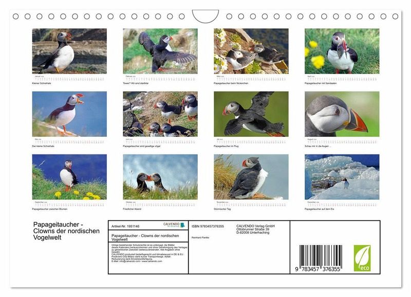 Der Fotograf und Journalist Reinhard Pantke begegnete während seiner Reisen durch den Norden Europa immer wieder den drollig-tollpatschigen Papageitauchern. Die bunten Vögel sind an abgelegenen Küsten Islands, Norwegens und Schottlands in der Brutzeit zwischen April und August an Land zu beobachten. Papageitaucher sind Maskottchen, Wappenvögel und die Lieblinge vieler Nordlandreisender. Lassen Sie sich begeistern von den Clowns der arktischen Vogelwelt, die dieser Kalender in verschiedenen Situationen zeigt.