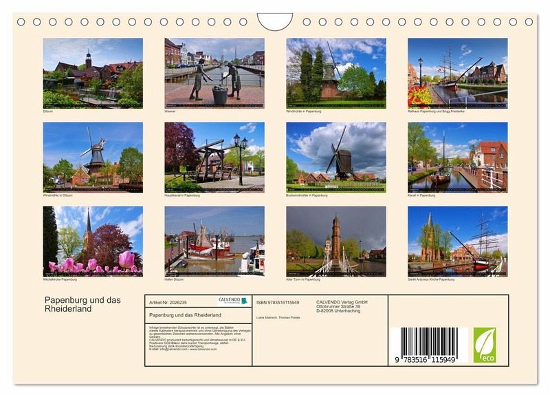 Papenburg im Nordwesten Deutschlands ist aus einer Fehnkolonie hervorgegangen und war ein Vorreiter der Moorkolonialisierung. Viele Kanäle prägen auch heute das malerische Stadtbild. Besuchen Sie mit diesem Kalender neben Papenburg auch die schönen Orte Weener und Ditzum im Rheiderland.
