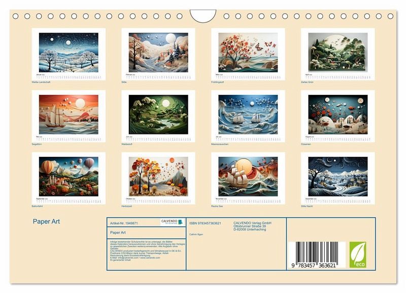 QUALITÄT - Hochwertiger Fotokalender mit 12 wunderschönen Motiven auf lichtbeständigem Bilderdruckpapier, robuste Spiralbindung mit Aufhängebügel.NACHHALTIG - deutliche Abfallreduzierung durch bedarfsgerechte Einzelstückfertigung, umweltfreundliches FSC-zertifiziertes Papier, Produktion in Deutschland, klimabewusste Logistik.PERFEKTES GESCHENK - Kalender für Freunde und Familie, für Kinder und Erwachsene, jung und alt, zu Weihnachten, Geburtstag oder zwischendurch.VIELFALT - Bildkalender in verschiedenen Formaten, z.B. DIN A5, DIN A4, DIN A3 sowie DIN A2. Ob Naturmotiv, Gemälde oder Fotos, ideal für ein persönliches Wohlfühlambiente.Landschaften aus origineller Papierkunst - KI generiert von Autor(in): Catill