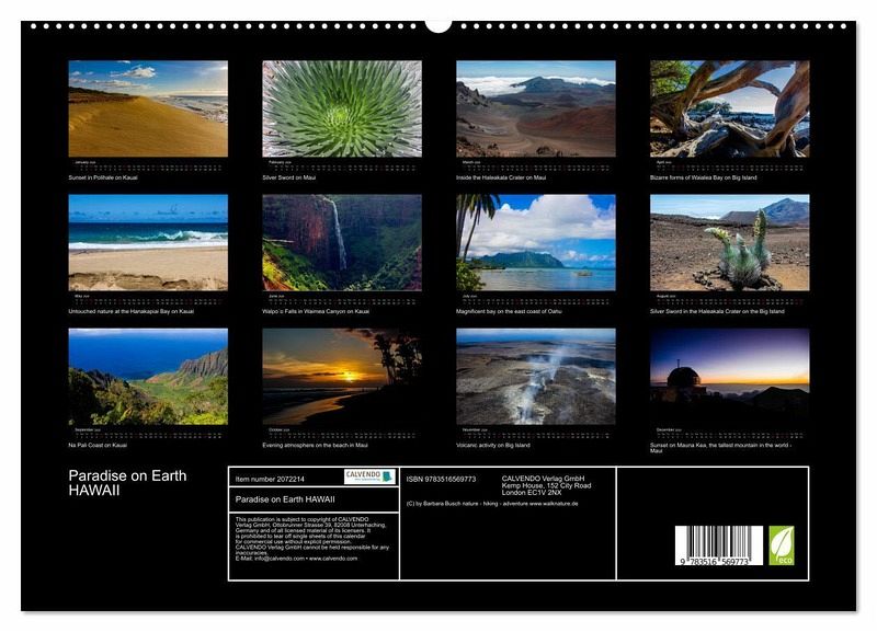 PREMIUM COLLECTION - Brilliant photo calendar with 12 beautiful motifs, high-gloss art print in museum quality.QUALITY - high-quality materials, sturdy back cover with 2 innovative insert pockets for optimum presentation on the wall.SUSTAINABLE - significant reduction in waste thanks to customised one-off production, environmentally friendly FSC-certified paper, production in Germany, climate-conscious logistics.PERFECT GIFT - calendars for friends and family, for children and adults, young and old, for Christmas, birthdays or in between.Atmospheric calendar with impressions from Hawaii von Autor(in): Barbara Busch