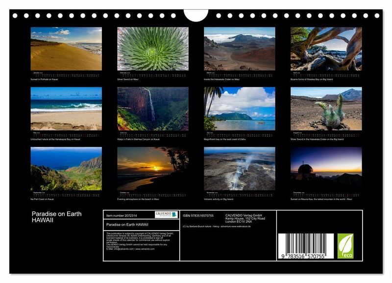 QUALITY - High-quality photo calendar with 12 beautiful images on light-resistant paper, robust spiral binding with hanger.SUSTAINABLE - Significant waste reduction due to print-on-demand production, environmentally friendly FSC-certified paper, produced in the UK, climate-conscious logistical processes.PERFECT GIFT - calendars for friends and family, for children, all ages and all occasions, from Christmas to birthdays and everything in between.LOTS OF CHOICE - Wall calendars in different sizes (DIN A4 and DIN A3), for any topic and personal taste, featuring photography, painting and illustrations.Atmospheric calendar with impressions from Hawaii, author: Barbara Busch