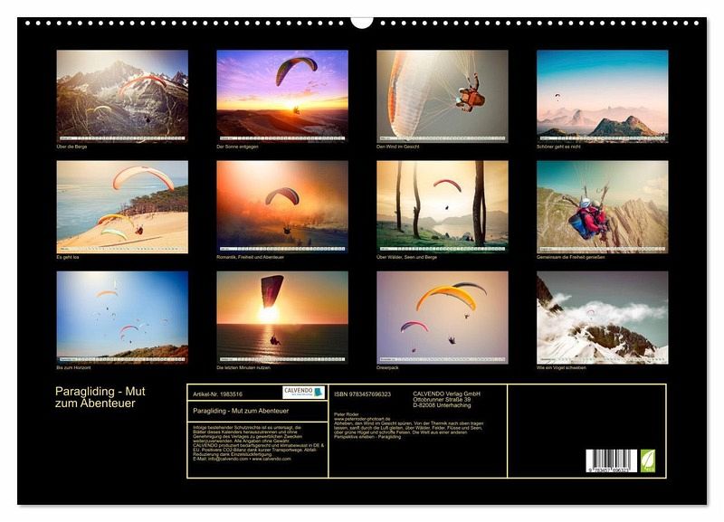 QUALITÄT - Hochwertiger Fotokalender mit 12 wunderschönen Motiven auf lichtbeständigem Bilderdruckpapier, robuste Spiralbindung mit Aufhängebügel.NACHHALTIG - deutliche Abfallreduzierung durch bedarfsgerechte Einzelstückfertigung, umweltfreundliches FSC-zertifiziertes Papier, Produktion in Deutschland, klimabewusste Logistik.PERFEKTES GESCHENK - Kalender für Freunde und Familie, für Kinder und Erwachsene, jung und alt, zu Weihnachten, Geburtstag oder zwischendurch.VIELFALT - Bildkalender in verschiedenen Formaten, z.B. DIN A5, DIN A4, DIN A3 sowie DIN A2. Ob Naturmotiv, Gemälde oder Fotos, ideal für ein persönliches Wohlfühlambiente.Paragliding - schweben ohne Grenzen mit dem Gleitschirm. von Autor(in): Peter Roder