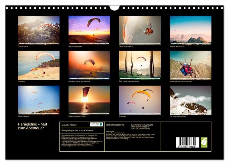 QUALITÄT - Hochwertiger Fotokalender mit 12 wunderschönen Motiven auf lichtbeständigem Bilderdruckpapier, robuste Spiralbindung mit Aufhängebügel.NACHHALTIG - deutliche Abfallreduzierung durch bedarfsgerechte Einzelstückfertigung, umweltfreundliches FSC-zertifiziertes Papier, Produktion in Deutschland, klimabewusste Logistik.PERFEKTES GESCHENK - Kalender für Freunde und Familie, für Kinder und Erwachsene, jung und alt, zu Weihnachten, Geburtstag oder zwischendurch.VIELFALT - Bildkalender in verschiedenen Formaten, z.B. DIN A5, DIN A4, DIN A3 sowie DIN A2. Ob Naturmotiv, Gemälde oder Fotos, ideal für ein persönliches Wohlfühlambiente.Paragliding - schweben ohne Grenzen mit dem Gleitschirm. von Autor(in): Peter Roder