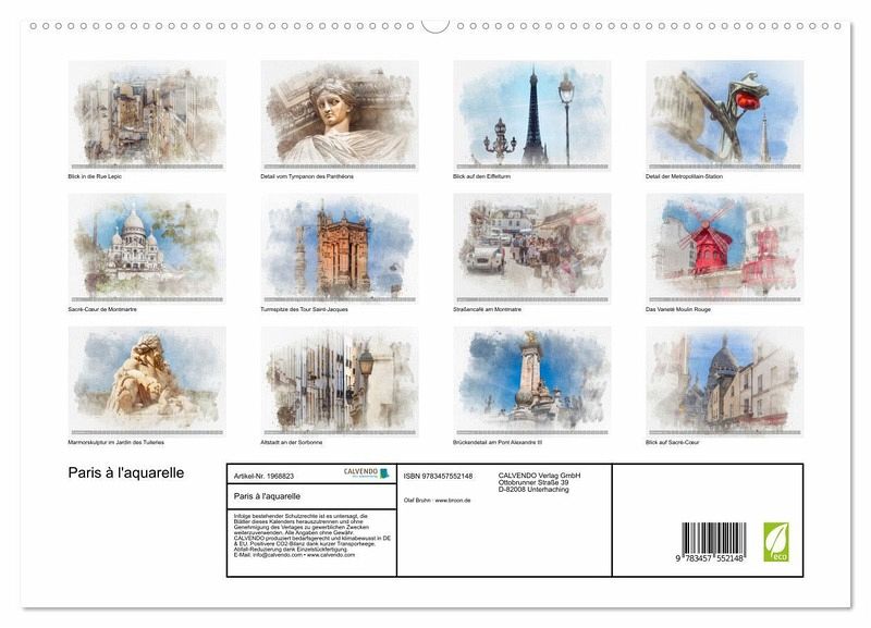 Gehen Sie mit Olaf Bruhn auf eine kleine Tour durch die französische Metropole. Das Besondere an diesem Kalender sind die luftig leichten Fotografien in Verbindung mit einem einzigartigen Aquarell-Look. Diese Kombination verleiht allen Bildern einen außergewöhnlichen Reiz.