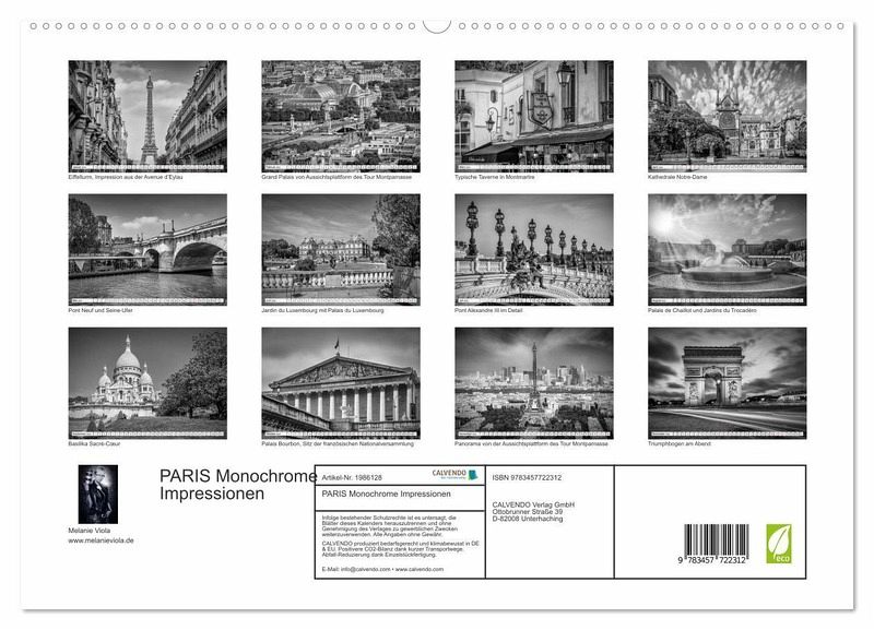 Unternehmen Sie eine Entdeckungstour durch Paris mit ihren vielen Attraktionen. Erleben Sie den Charme der Stadt, die monumentalen Bauten, das Ufer der Seine, erholsame Parkanlagen und typische Straßenszenen. 12 harmonische Schwarz-Weiß-Fotografien führen durch die malerische Metropole.