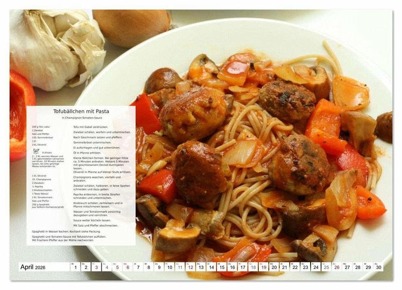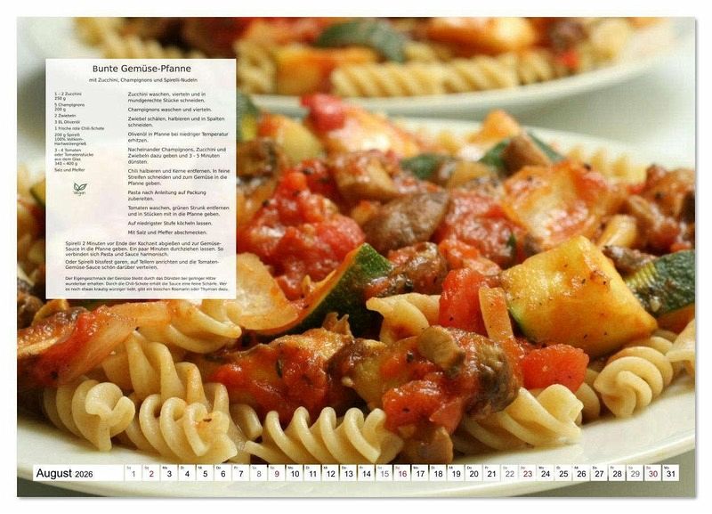 Dieser Kalender zeigt 12 leckere und einfache Rezepte für Pasta-Gerichte mit viel Gemüse. Schöne Food Fotos laden zum Nachkochen ein. Aus wenigen Zutaten einfach und schnell zubereitet, ohne stundenlang in der Küche zu stehen. Selber kochen mit Gemüse macht Spaß und bringt Abwechslung auf den Teller - gesund und lecker. Vollkorn-Pasta und Gemüse sind voller Ballaststoffe, die das Immunsystem stärken und langanhaltend satt machen. Vegetarisch oder vegan? Einfach mal ausprobieren und genießen.