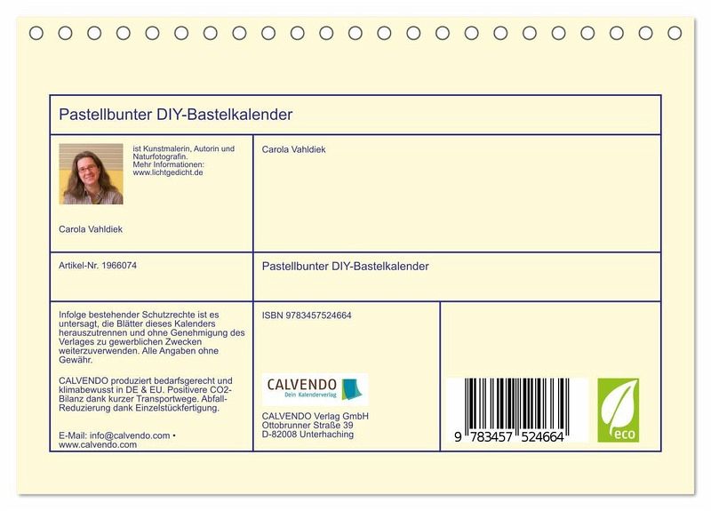 QUALITÄT - Hochwertiger Fotokalender mit 12 wunderschönen Motiven auf lichtbeständigem Bilderdruckpapier, robuste Spiralbindung.NACHHALTIG - deutliche Abfallreduzierung durch bedarfsgerechte Einzelstückfertigung, umweltfreundliches FSC-zertifiziertes Papier, Produktion in Deutschland, klimabewusste Logistik.PERFEKTES GESCHENK - Kalender für Freunde und Familie, für Kinder und Erwachsene, jung und alt, zu Weihnachten, Geburtstag oder zwischendurch.VIELFALT - Bildkalender in verschiedenen Formaten, z.B. DIN A5, DIN A4, DIN A3 sowie DIN A2. Ob Naturmotiv, Gemälde oder Fotos, ideal für ein persönliches Wohlfühlambiente.Hochwertiger Do-it-yourself-Kalender für Fotos, zum Malen, Basteln und Selbstgestalten - für Kinder und Erwachsene von Autor(in): Carola Vahldiek