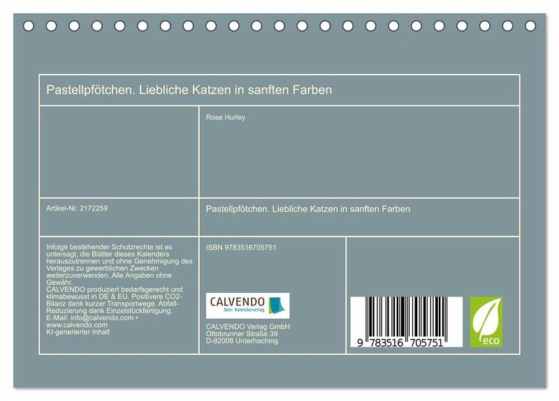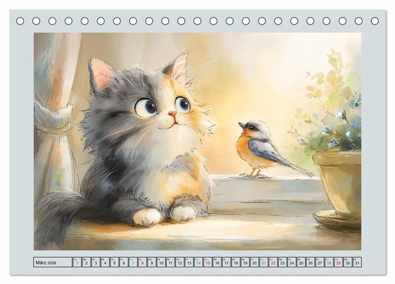Dieser Kalender zeigt niedliche Kätzchen, die durch alle Jahreszeiten tollen. Jede Illustration wurde in zarten Aquarell-Pastelltönen gestaltet und vermittelt eine ruhige und harmonische Stimmung. Alle Bilder wurden mit der Hilfe von KI erstellt und zeigen verspielte und liebliche Szenen für alle Katzenfreunde und Aquarell-Liebhaber.