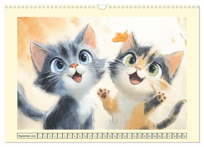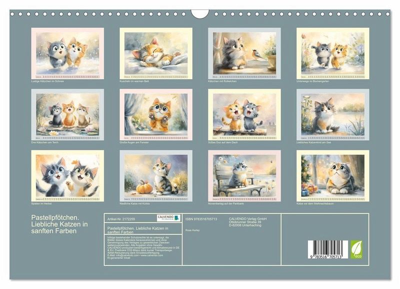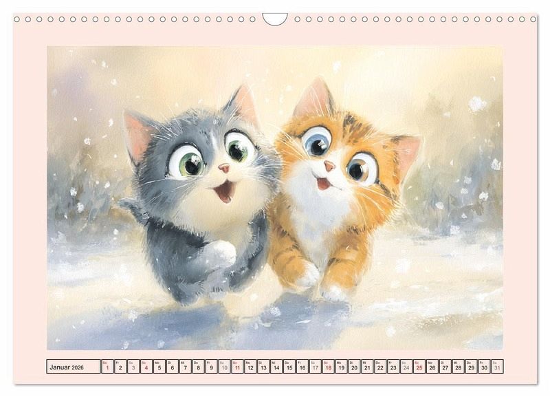 Dieser Kalender zeigt niedliche Kätzchen, die durch alle Jahreszeiten tollen. Jede Illustration wurde in zarten Aquarell-Pastelltönen gestaltet und vermittelt eine ruhige und harmonische Stimmung. Alle Bilder wurden mit der Hilfe von KI erstellt und zeigen verspielte und liebliche Szenen für alle Katzenfreunde und Aquarell-Liebhaber.