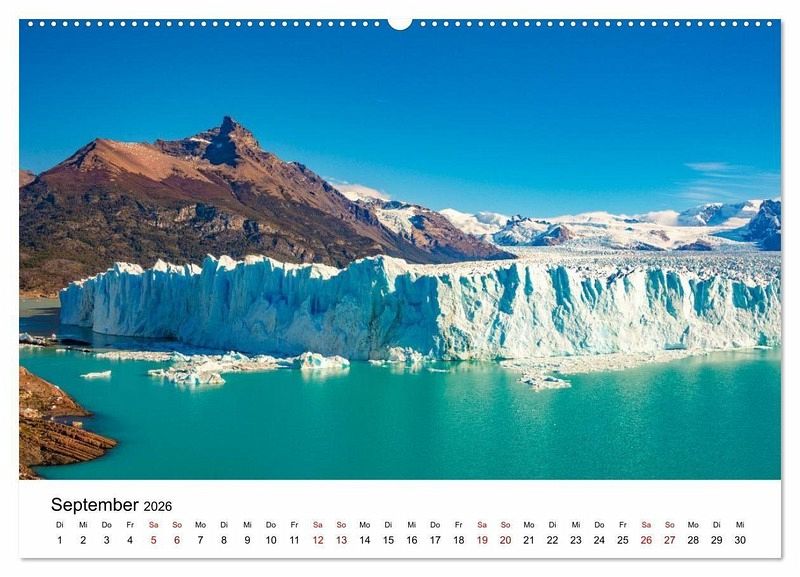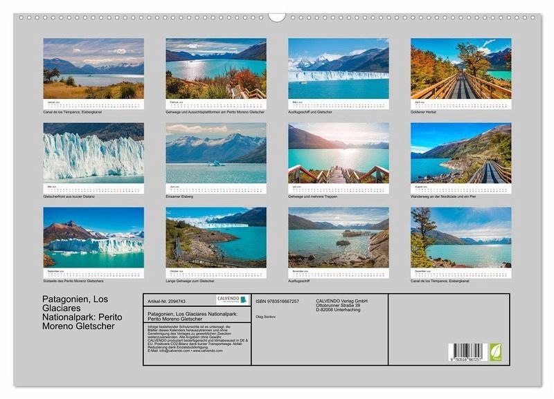 Im Süden Argentiniens erstreckt sich eine der spektakulärsten Landschaften der Welt: der Los Glaciares Nationalpark in Patagonien - ein UNESCO-Weltnaturerbe. Majestätische Eiswände, tiefblaue Gletscher, spiegelnde Seen, einsame Eisberge und eine vielfältige Tierwelt prägen diese Region rund um den berühmten Perito-Moreno-Gletscher. Dieser Kalender fängt die eisige Schönheit und wilde Weite Patagoniens ein - von fliegenden Flamingos bis zu wandernden Besuchern auf den endlosen Stegen entlang der Gletscherkante.