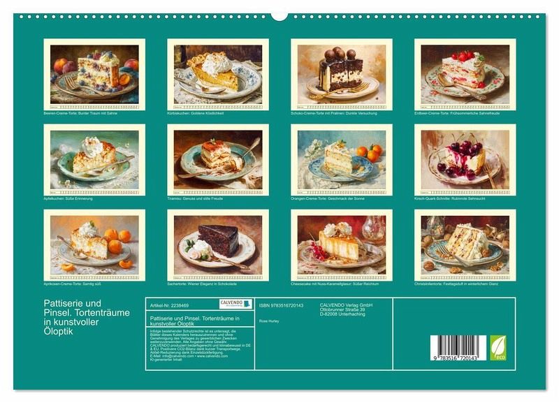 Dieser Kalender feiert die Kunst des Genießens im Ölbilder-Stil. Jedes Bild zeigt ein köstliches Tortenstück, zart begleitet von Sahne, Früchten und Nüssen. Alle Bilder wurden mit Hilfe von KI erstellt und verbinden zeitlose Maltechnik mit moderner Kreativität. So entstand Monat für Monat ein poetischer Augenblick des süßen Lebens, der verführerisch in Farbe, Licht und Geschmack schimmert.