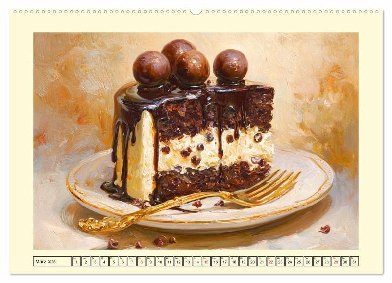 Dieser Kalender feiert die Kunst des Genießens im Ölbilder-Stil. Jedes Bild zeigt ein köstliches Tortenstück, zart begleitet von Sahne, Früchten und Nüssen. Alle Bilder wurden mit Hilfe von KI erstellt und verbinden zeitlose Maltechnik mit moderner Kreativität. So entstand Monat für Monat ein poetischer Augenblick des süßen Lebens, der verführerisch in Farbe, Licht und Geschmack schimmert.