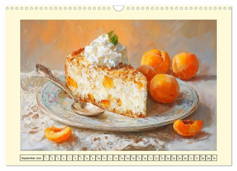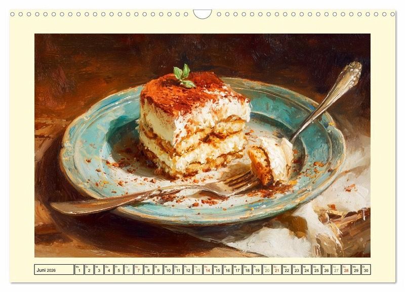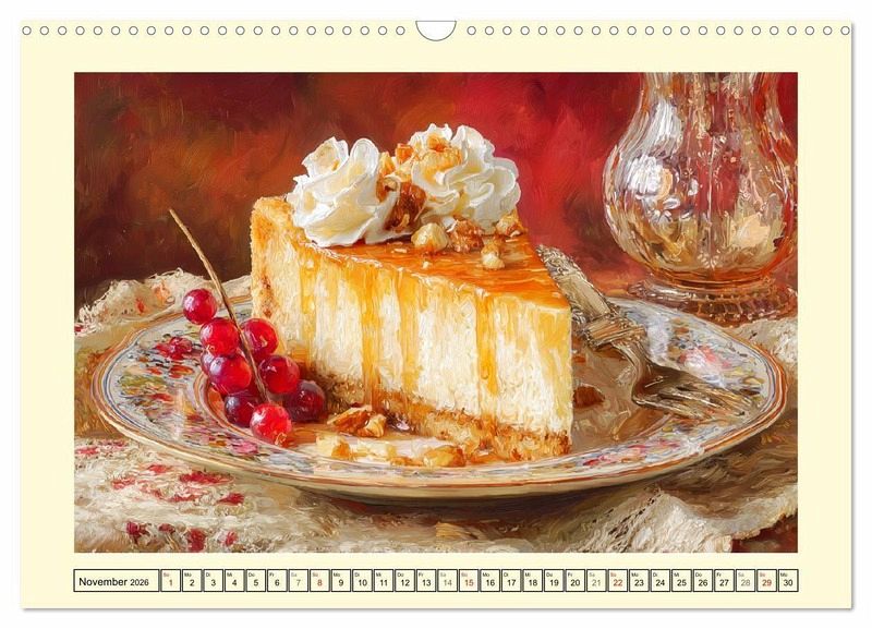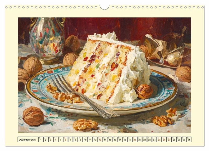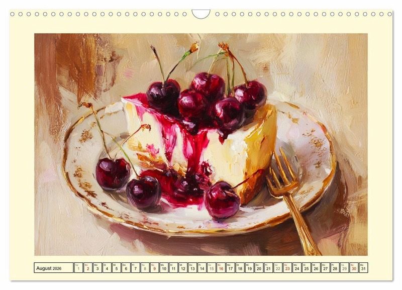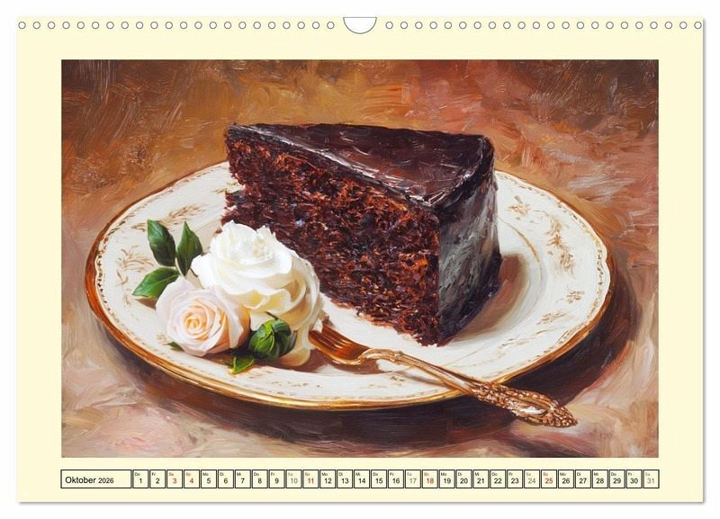 Dieser Kalender feiert die Kunst des Genießens im Ölbilder-Stil. Jedes Bild zeigt ein köstliches Tortenstück, zart begleitet von Sahne, Früchten und Nüssen. Alle Bilder wurden mit Hilfe von KI erstellt und verbinden zeitlose Maltechnik mit moderner Kreativität. So entstand Monat für Monat ein poetischer Augenblick des süßen Lebens, der verführerisch in Farbe, Licht und Geschmack schimmert.