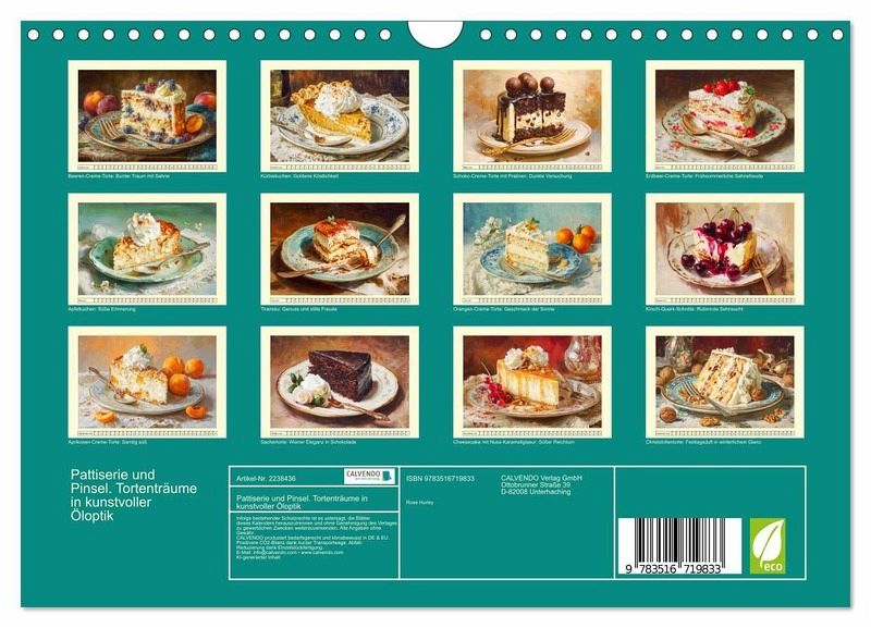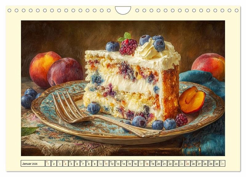 Dieser Kalender feiert die Kunst des Genießens im Ölbilder-Stil. Jedes Bild zeigt ein köstliches Tortenstück, zart begleitet von Sahne, Früchten und Nüssen. Alle Bilder wurden mit Hilfe von KI erstellt und verbinden zeitlose Maltechnik mit moderner Kreativität. So entstand Monat für Monat ein poetischer Augenblick des süßen Lebens, der verführerisch in Farbe, Licht und Geschmack schimmert.