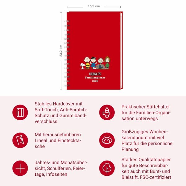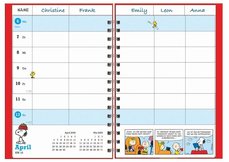 - Immer alle Termine fest im Griff, mit dem neuen Peanuts A5-Terminkalender in Buchform 2026- Die schönsten Weisheiten und Cartoons von Charlie Brown, Snoopy und ihren Freunden, auf 160 Seiten im platzsparenden 15,2 x 23,2-Hochformat mit Spiralbindung- Für alle, die richtig was vorhaben - unser erfolgreiches Konzept für Familienplaner: 5 Namens-Spalten mit ausreichend Platz für Arzttermine, Playdates und Co. - Der große Familienkalender mit zahlreichen Extras: Inklusive Wochenkalendarium, Monats- und Schulferienübersicht, To Do-Listen, Lineal und Einstecktasche- Begeistert Peanuts-Freunde von jung bis alt: Ein Kalender-Klassiker aus dem Hause Heye im Athesia Kalenderverlag