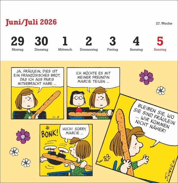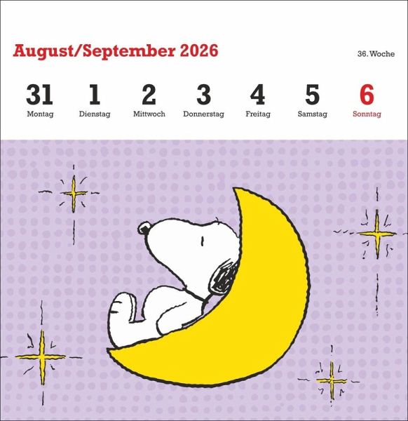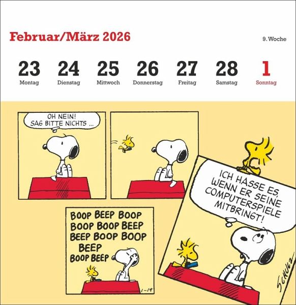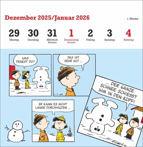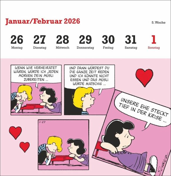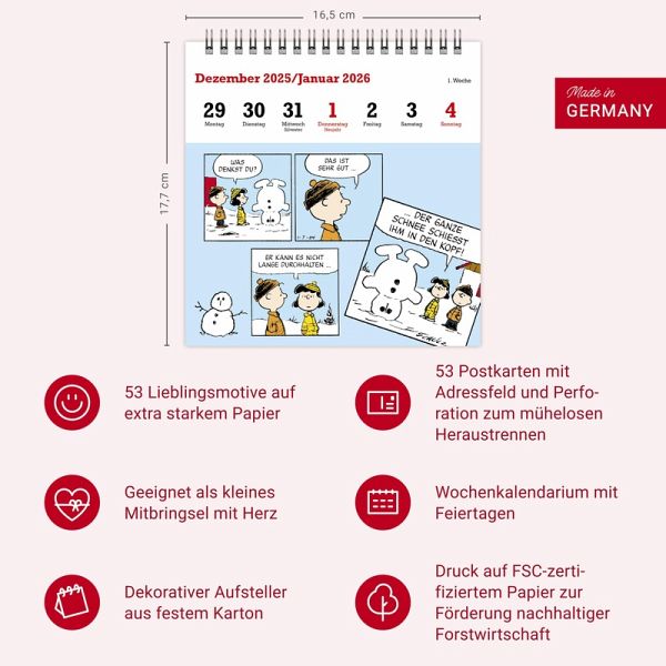 - Große Comic-Lieblinge im kleinen Kalender: Der Peanuts-Kalender 2026- Woche für Woche witzige Cartoons von Snoopy und Co. als Postkarte: Kalender mit 53 Motiven und Comics über die Abenteuer der Peanuts- Starker Auftritt im funktionalen Format: Wochen-Tischkalender zum Aufstellen mit den Maßen 16,5 x 17,7 cm- Begeistert Comic-Fans: Ein toller Blickfang für den eigenen Schreibtisch oder zum Verschenken- Nur die schönsten Motive zum Sammeln und Verschicken: Postkartenkalender von Heye im Athesia Kalenderverlag