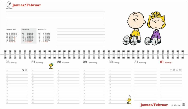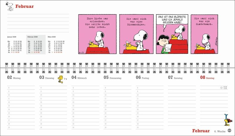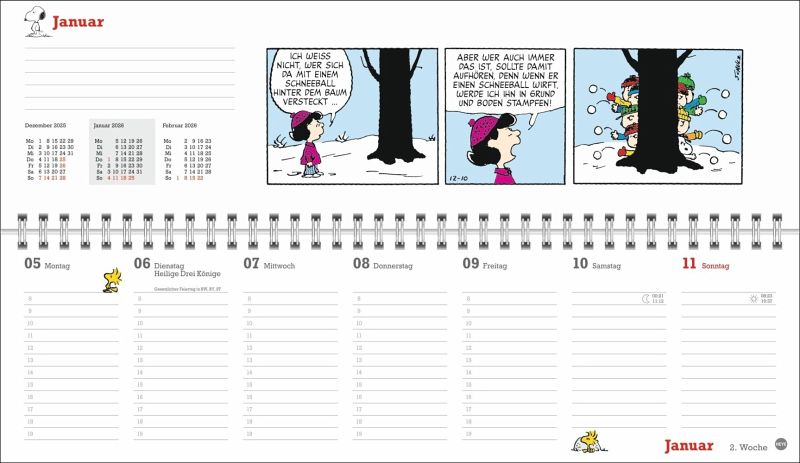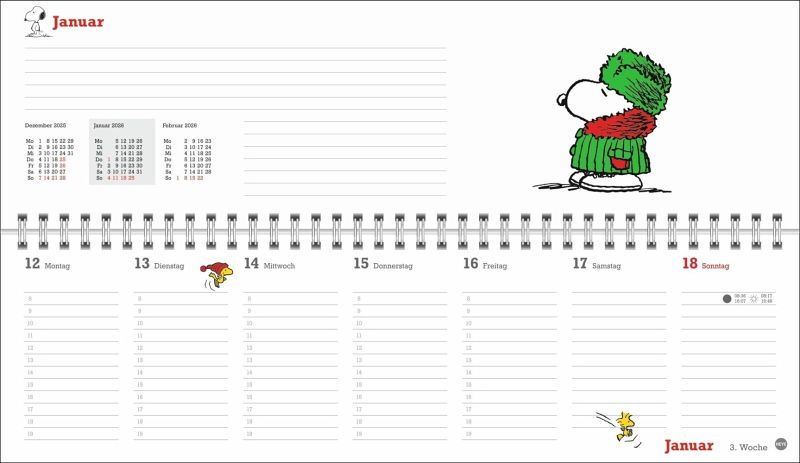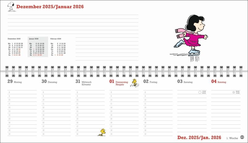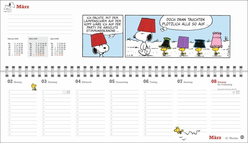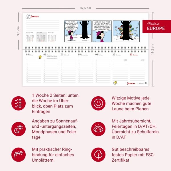 - Woche für Woche gut gelaunt durch den Büroalltag, mit dem Tischquerkalender 2026 von den Peanuts- Cartoons mit den beliebten Peanuts-Figuren- Der Organisations-Allrounder für jeden Schreibtisch: Kalender zum Umklappen mit viel Platz für Eintragungen und Büro-Kritzeleien- Alles Wichtige auf einen Blick: Spiral-Wochenkalender im praktischen 32,5 x 9,3 cm Querformat- Begeistert die Fans von Snoopy, Charlie Brown und Co. in jedem Alter: Ein Tischkalender-Klassiker aus dem Hause Heye im Athesia Kalenderverlag