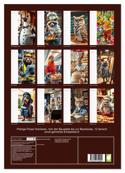 PREMIUM-LINIE - Brillanter Fotokalender mit 12 wunderschönen Motiven, Kunstdruck in Hochglanz in Museumsqualität.QUALITÄT - edle Materialien, stabile Rückwand mit 2 innovativen Einstecktaschen für eine optimale Präsentation an der Wand.NACHHALTIG - deutliche Abfallreduzierung durch bedarfsgerechte Einzelstückfertigung, umweltfreundliches FSC-zertifiziertes Papier, Produktion in Deutschland, klimabewusste Logistik.PERFEKTES GESCHENK - Kalender für Freunde und Familie, für Kinder und Erwachsene, jung und alt, zu Weihnachten, Geburtstag oder zwischendurch.Tierische Berufe, witzig verkleidet von Autor(in): Michaela Spreider
