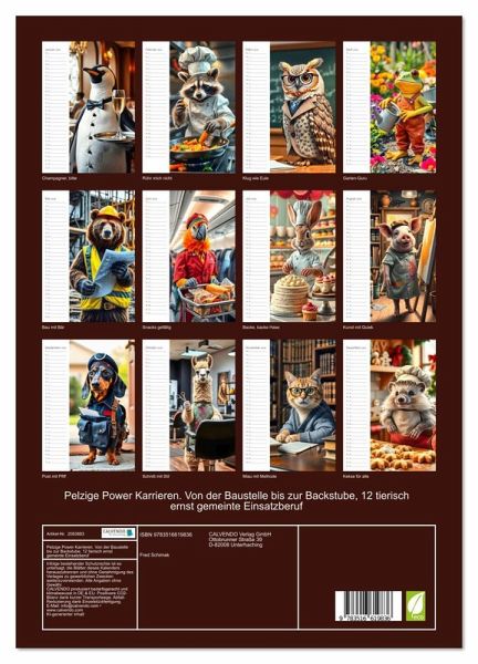 Ein ganzes Jahr lang begleiten uns Tiere in ungewöhnlichen Rollen. Ob als Kellner, Postbote oder Weihnachtsbäcker, hier schlüpfen Pinguin, Dackel und Co. in charmante Verkleidungen und präsentieren sich inmitten menschlicher Berufe. Die KI generierten, fotorealistischen Bilder zeigen liebevoll inszenierte Alltagsszenen mit tierischem Humor. Originell, überraschend und mit einem Augenzwinkern gestaltet. Ideal für alle, die kreative Kalender mit Herz und Witz lieben.
