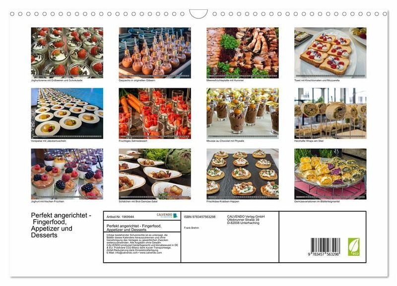 QUALITÄT - Hochwertiger Fotokalender mit 12 wunderschönen Motiven auf lichtbeständigem Bilderdruckpapier, robuste Spiralbindung mit Aufhängebügel.NACHHALTIG - deutliche Abfallreduzierung durch bedarfsgerechte Einzelstückfertigung, umweltfreundliches FSC-zertifiziertes Papier, Produktion in Deutschland, klimabewusste Logistik.PERFEKTES GESCHENK - Kalender für Freunde und Familie, für Kinder und Erwachsene, jung und alt, zu Weihnachten, Geburtstag oder zwischendurch.VIELFALT - Bildkalender in verschiedenen Formaten, z.B. DIN A5, DIN A4, DIN A3 sowie DIN A2. Ob Naturmotiv, Gemälde oder Fotos, ideal für ein persönliches Wohlfühlambiente.Kleine Häppchen, groß aufgefahren - das mag das Motto dieser Bilderserie sein. Die exklusiv angerichteten Buffets auf diversen Veranstaltungen sind ein echter Hingucker in der Küche. von Autor(in): Frank Brehm