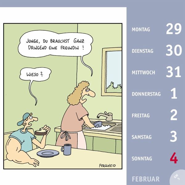 53 Postkarten mit feinstem Perscheid-HumorWochenübersicht mit Angabe von Feiertagen und KalenderwochenPerforation zum einfachen Heraustrennen der KartenEin Kalender zum Aufstellen oder AufhängenFormat: 17,5 x 17,5 cm