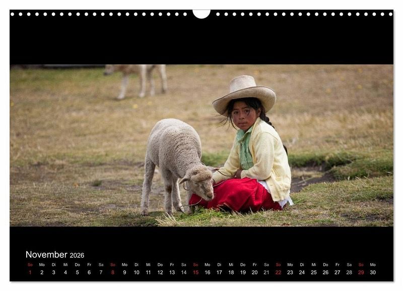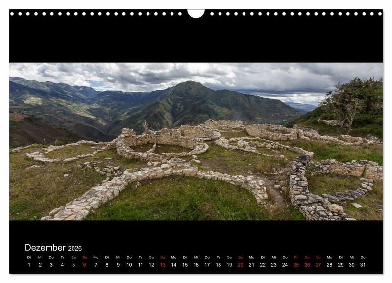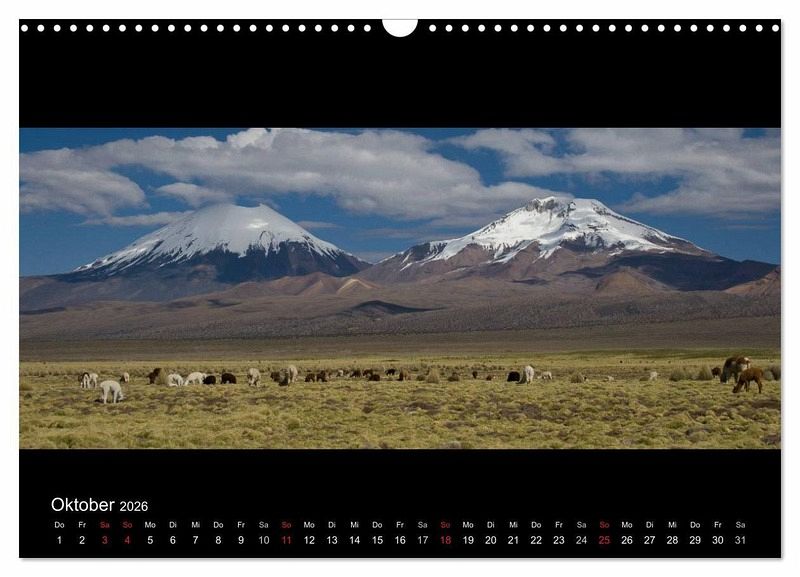 Dieser Kalender zeigt in seinen Aufnahmen den 771 m hohen Wasserfall Gocta, die Ruinen der Bergfestung Kuelap, die scheinbar endlos wirkende Salzwüste Uyuni, Vulkane mit Gipfeln aus ewigem Eis und Momente aus dem Leben der andinen Bevölkerung,