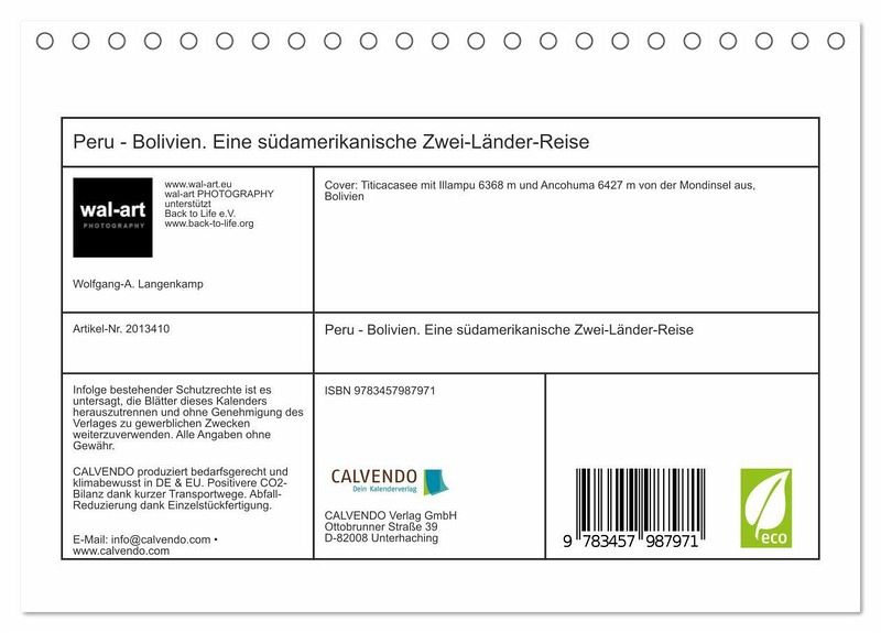 QUALITÄT - Hochwertiger Fotokalender mit 12 wunderschönen Motiven auf lichtbeständigem Bilderdruckpapier, robuste Spiralbindung.NACHHALTIG - deutliche Abfallreduzierung durch bedarfsgerechte Einzelstückfertigung, umweltfreundliches FSC-zertifiziertes Papier, Produktion in Deutschland, klimabewusste Logistik.PERFEKTES GESCHENK - Kalender für Freunde und Familie, für Kinder und Erwachsene, jung und alt, zu Weihnachten, Geburtstag oder zwischendurch.VIELFALT - Bildkalender in verschiedenen Formaten, z.B. DIN A5, DIN A4, DIN A3 sowie DIN A2. Ob Naturmotiv, Gemälde oder Fotos, ideal für ein persönliches Wohlfühlambiente.Eine Kultur- und Trekkingreise durch Peru und Bolivien von Autor(in): Wolfgang A. Langenkamp