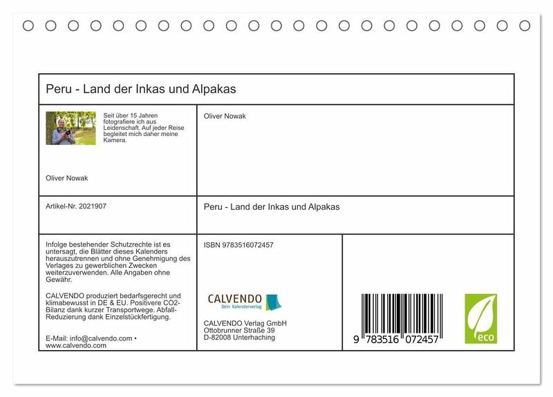 QUALITÄT - Hochwertiger Fotokalender mit 12 wunderschönen Motiven auf lichtbeständigem Bilderdruckpapier, robuste Spiralbindung.NACHHALTIG - deutliche Abfallreduzierung durch bedarfsgerechte Einzelstückfertigung, umweltfreundliches FSC-zertifiziertes Papier, Produktion in Deutschland, klimabewusste Logistik.PERFEKTES GESCHENK - Kalender für Freunde und Familie, für Kinder und Erwachsene, jung und alt, zu Weihnachten, Geburtstag oder zwischendurch.VIELFALT- Bildkalender in verschiedenen Formaten, z.B. DIN A5, DIN A4, DIN A3 sowie DIN A2. Ob Naturmotiv, Gemälde oder Fotos, ideal für ein persönliches Wohlfühlambiente.Peru - Heimat der Alpakas und des alten Inkareiches von Autor(in): Oliver Nowak