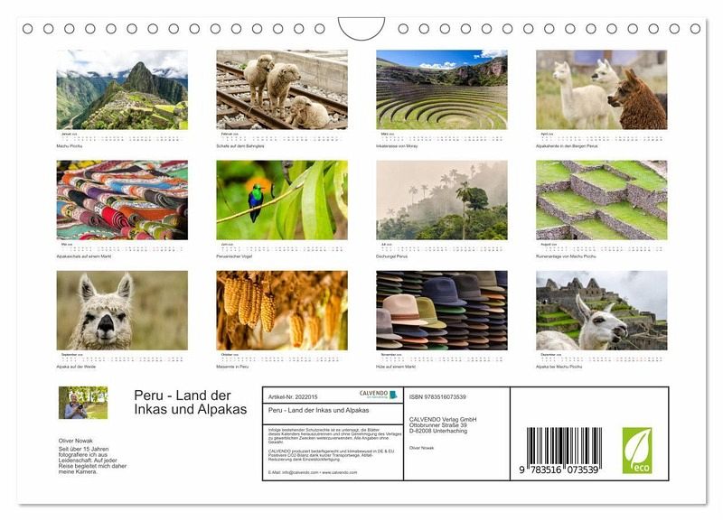 QUALITÄT - Hochwertiger Fotokalender mit 12 wunderschönen Motiven auf lichtbeständigem Bilderdruckpapier, robuste Spiralbindung mit Aufhängebügel.NACHHALTIG - deutliche Abfallreduzierung durch bedarfsgerechte Einzelstückfertigung, umweltfreundliches FSC-zertifiziertes Papier, Produktion in Deutschland, klimabewusste Logistik.PERFEKTES GESCHENK - Kalender für Freunde und Familie, für Kinder und Erwachsene, jung und alt, zu Weihnachten, Geburtstag oder zwischendurch.VIELFALT - Bildkalenderin verschiedenen Formaten, z.B. DIN A5, DIN A4, DIN A3 sowie DIN A2. Ob Naturmotiv, Gemälde oder Fotos, ideal für ein persönliches Wohlfühlambiente.Peru - Heimat der Alpakas und des alten Inkareiches von Autor(in): Oliver Nowak