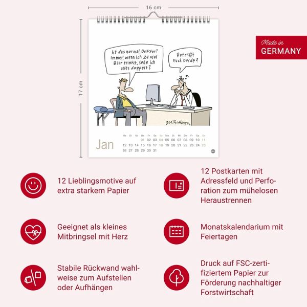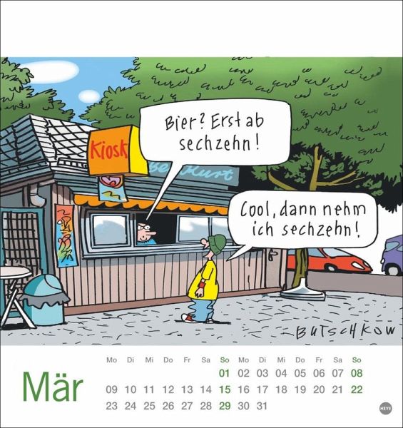 - Ein kühles Bier passt einfach immer - natürlich auch in einem Postkarten-Tischkalender!- Peter Butschkow-Cartoons für Fans der Hopfenkaltschale: Monat für Monat lustige Postkarten zum Sammeln und Verschicken in einem Bier-Kalender im Format 16 x 17 cm- Ein Butschkow-Kalender mit dem typisch treffsicheren Humor des erfolgreichen Cartoonisten- Ein großartiges Geschenk für Bierliebhaber: Der kleine Kalender zum Aufstellen passt auf jede Theke- Immer für einen Lacher gut: Die Humor-Kalender im Postkartenformat von Heye im Athesia Kalenderverlag