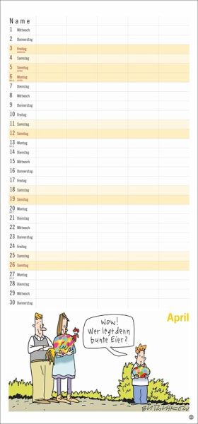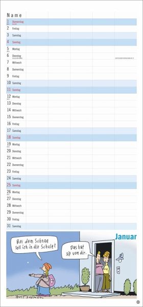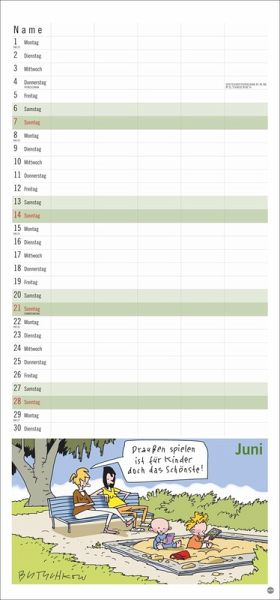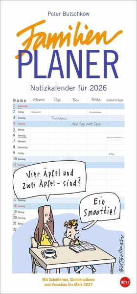 - Lachen hilft: Gut gelaunt durch den Alltag mit dem Butschkow Familienkalender 2026- Für die tägliche Dosis Humor: Praktischer Monats-Planer mit Cartoons von Peter Butschkow über vorlaute Rotznasen, pubertäre Teenager und Eltern am Rande des Wahnsinns- Organisationshilfe für Groß und Klein: Kalender mit Schulferien, Stundenplänen und 3-Monats-Vorschau aufs Folgejahr, im kompakten 21 x 45 cm Hochformat- Das Raumwunder unter den Familienplanern: 5 Spalten Platz für wichtige Termine, Ferien- und Freizeitaktivitäten- Gemeinsam schöner Pläne schmieden: Die Familien-Wandkalender von Heye aus dem Athesia Kalenderverlag