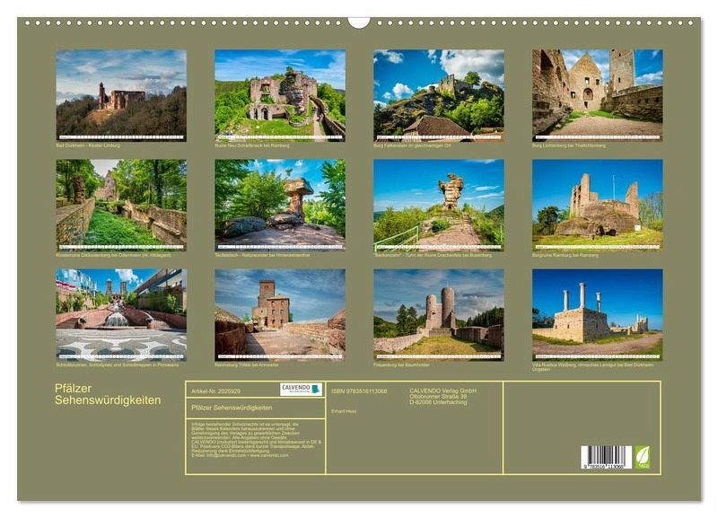 Mit der Pfalz verbinden viele wohl zuerst die Lebensart: Gemütlichkeit mit gutem Essen und Trinken. Dass die Pfalz aber auch viele Sehenswürdigkeiten bietet, ist weniger bekannt. Burgen und Schlösser gibt es zum Beispiel in einer höheren Dichte und Vielzahl als am Mittelrhein, den man zuerst damit verbindet. In diesem Kalender wird versucht, einen kleinen Querschnitt über Burgen, Schlösser und andere Sehenswürdigkeiten zu zeigen.