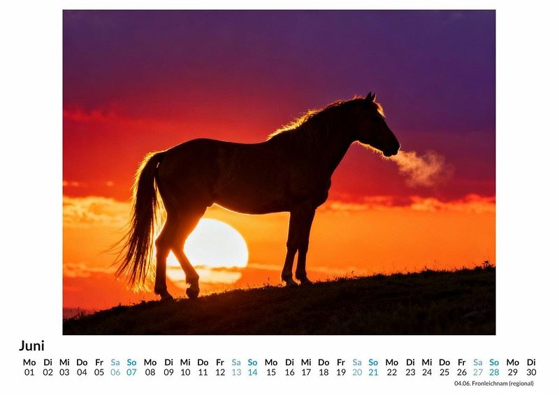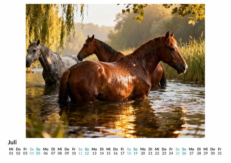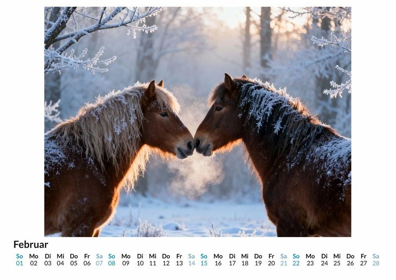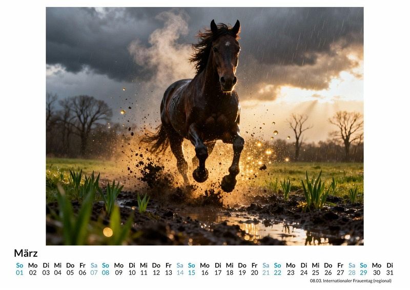 Ein Hufschlag, der durch die Zeit hallt. Ein Blick, der von ungezähmter Kraft und sanfter Anmut erzählt. Der Kalender "Pferd" fängt die Essenz dieser faszinierenden Tiere in zwölf einzigartigen Momenten ein, die das Wesen von zeitloser Eleganz und Stärke verkörpern. Dieser Kalender ist die ideale Wahl: Für alle, deren Herz im Takt der Hufe schlägt. Für Liebhaber von ästhetischer Fotografie und stilvoller Wanddekoration. Für Menschen, die sich von der Kraft und Gelassenheit der Natur inspirieren lassen. Jeder Monat enthüllt eine neue Facette der pferdischen Seele, eingefangen in Kompositionen aus Licht und Schatten. Von der dynamischen Bewegung im Galopp, bei der Muskeln unter glänzendem Fell spielen, bis zum stillen Moment der Einkehr in einer nebligen Landschaft. Die Motive fangen die zeitlose Eleganz und die unbändige Stärke dieser Geschöpfe ein. Jedes Bild wurde durch das Zusammenspiel von menschlicher Vision und computergestützter Kreation zum Leben erweckt und stellt eine moderne Interpretation des klassischen Pferdemotivs dar. Was dieser Kalender bietet: Zwölf Monatsblätter mit besonderen Pferdemotiven. Ein praktisches Kalendarium für die Organisation des Alltags. Ein stilvoller Wandschmuck, der das ganze Jahr über Freude bereitet. Der Kalender "Pferd" ist mehr als nur ein Zeitmesser. Er ist eine tägliche Hommage an die Anmut und Kraft, die in diesen Tieren wohnt. Ein Begleiter, der das Jahr mit Momenten der Schönheit und Inspiration füllt. Eine Einladung, die Verbindung zwischen Mensch und Natur jeden Tag neu zu entdecken. Es lohnt sich, einen Blick auf die einzelnen Monatsmotive zu werfen.