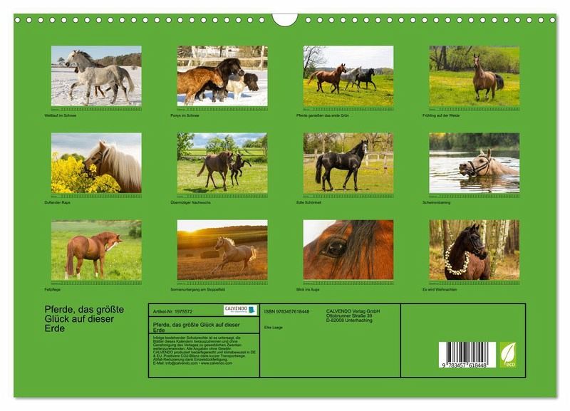 QUALITÄT - Hochwertiger Fotokalender mit 12 wunderschönen Motiven auf lichtbeständigem Bilderdruckpapier, robuste Spiralbindung mit Aufhängebügel.NACHHALTIG - deutliche Abfallreduzierung durch bedarfsgerechte Einzelstückfertigung, umweltfreundliches FSC-zertifiziertes Papier, Produktion in Deutschland, klimabewusste Logistik.PERFEKTES GESCHENK - Kalender für Freunde und Familie, für Kinder und Erwachsene, jung und alt, zu Weihnachten, Geburtstag oder zwischendurch.VIELFALT - Bildkalender in verschiedenen Formaten, z.B. DIN A5, DIN A4, DIN A3 sowie DIN A2. Ob Naturmotiv, Gemälde oder Fotos, ideal für ein persönliches Wohlfühlambiente.Nicht ohne Grund heißt es, Pferde machen glücklich von Autor(in): ella